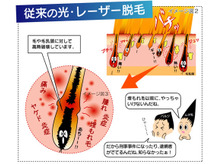 一般的なIPL脱毛はお肌の毛根に対してのアプローチとなり、高熱で脱毛処理している為お肌がダメージを受け痛みが出ます。火傷をすると痛みを感じるのと同じです。また最近主流となりつつあるSHR脱毛はお肌の毛根全体を包み込んでいる「毛包」に対して中程度の熱を与え、毛を作る領域にダメージを与える脱毛方式です。両方お肌の中にある肌組織に対して熱でダメージを与える為、脱毛の際に痛みがでます!その為アトピーや敏感肌の方はお肌の状態が悪化する可能性があります。