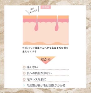 しかしハイパースキン脱毛は、毛根を焼き切る方法ではなく、毛の種である[発毛因子]に当てるので温度は38℃くらいのお肌に優しい温度です。
