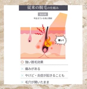 通常は今生えている毛の奥(毛根)に熱を届かせ、毛根を焼き切きるやり方をしています。