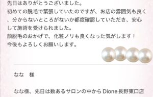 美肌脱毛専門サロン Dione長野東口店です❣️ お客様からのお声紹介です🌟 いつもとても嬉しいご感想 本当にありがとうございます🙇ɤ […]