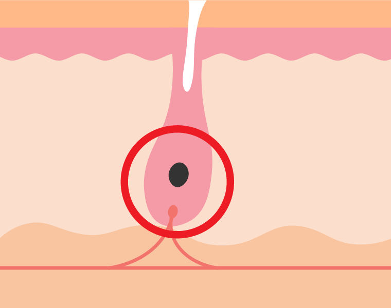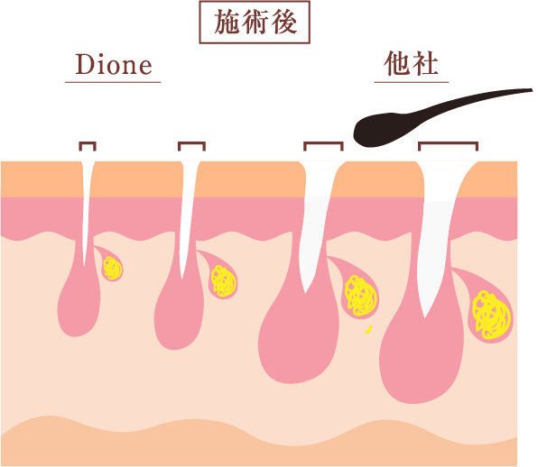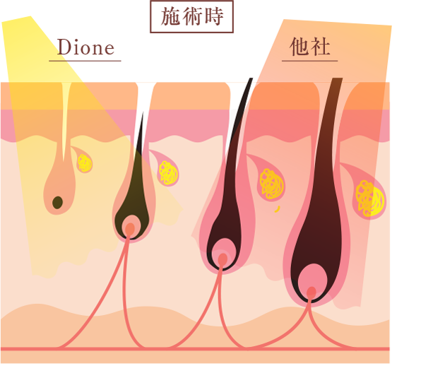 毛穴は発毛時に広がるため、一般の脱毛では毛穴が大きいままになってしまいますが、Dioneは毛穴が小さいときにアプローチできるので、毛穴の目立たない美肌が実現します。