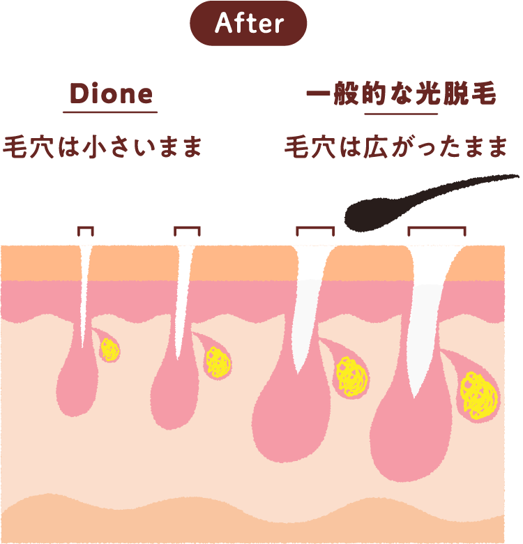 Dioneの脱毛は、あえて最も毛穴が小さくなっている状態の毛の休止期にアプローチするので、毛穴への負担がなく綺麗な仕上がりに。肌トラブルの心配もありません。